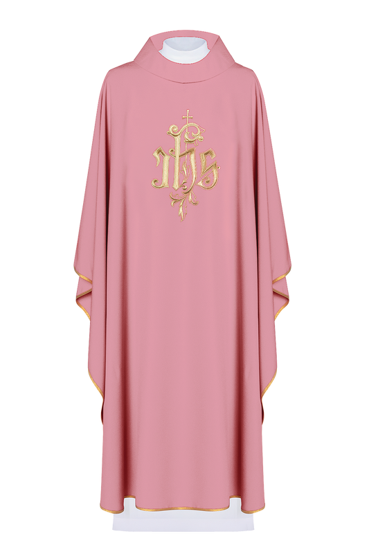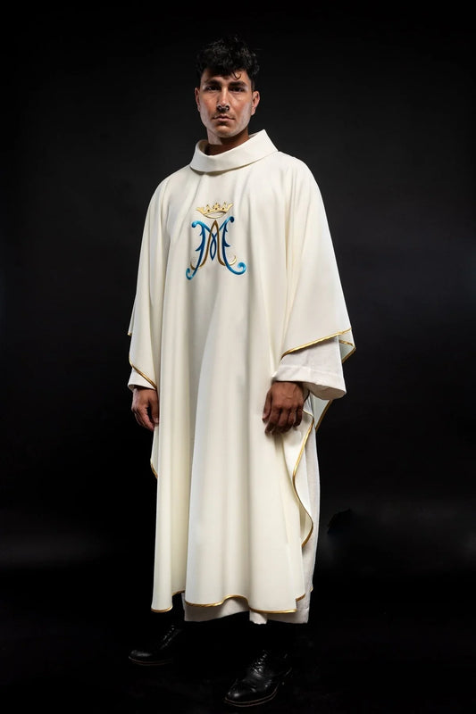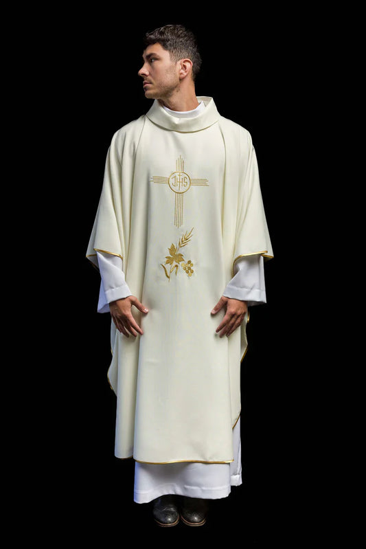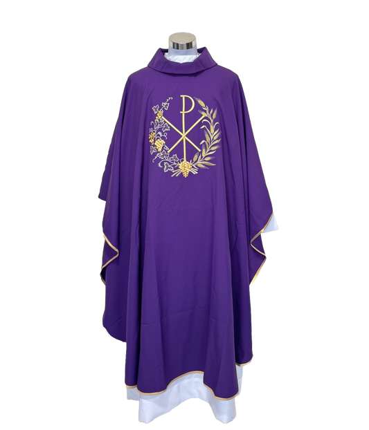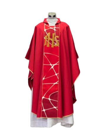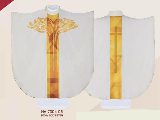 Casulla Poliéster con galón bordado y patrón sublimado.