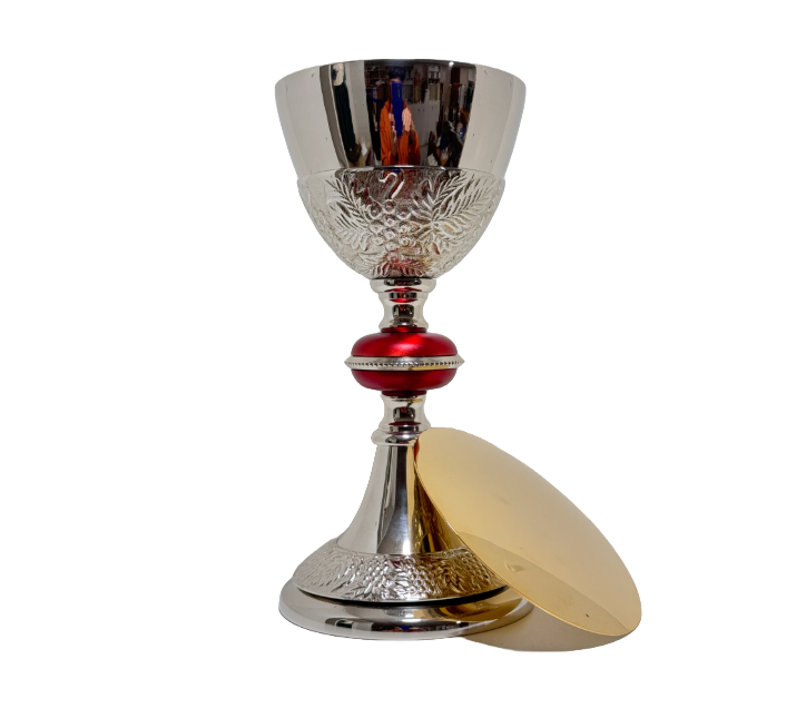 ¡Celebra la Eucaristía con este cáliz de altura 24cm de latón niquelado y plateado! La copa bañada en oro por dentro de 0,4 L garantiza una ceremonia sagrada. Incluye patena de 14 cm de diámetro en su alcance de entrega.