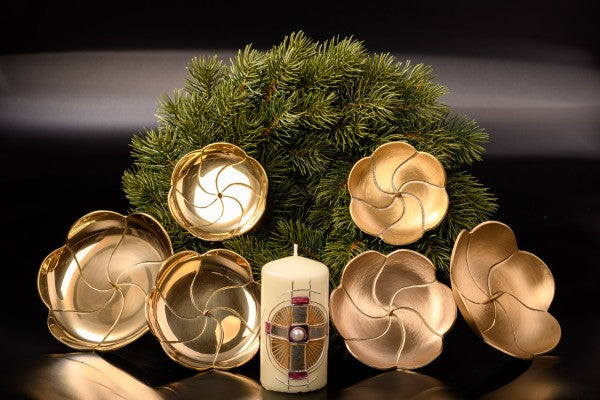 La placa de la corona es de latón, dorada y pulida. Es redonda y su diámetro es de 12 cm. El plato de la corona de Adviento tiene un diseño de loto.
