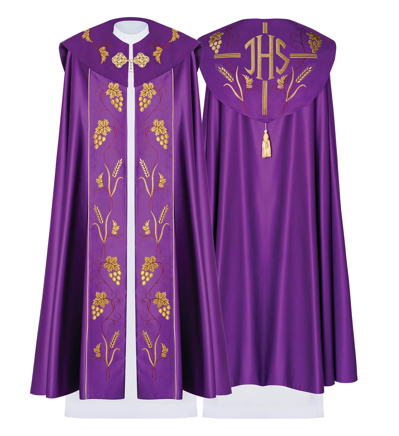La capa está confeccionada en tejido de satén liso de alta calidad. Decorada con bordados dorados y burdeos. Capucha con el símbolo IHS.