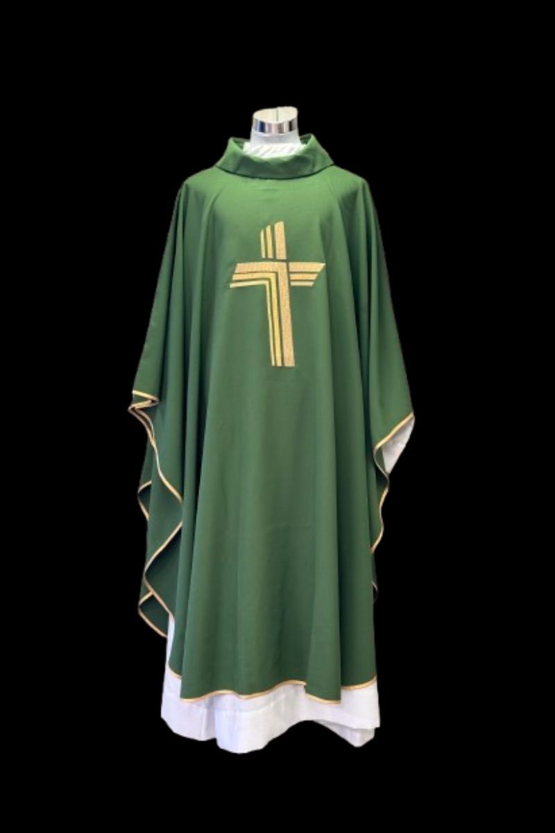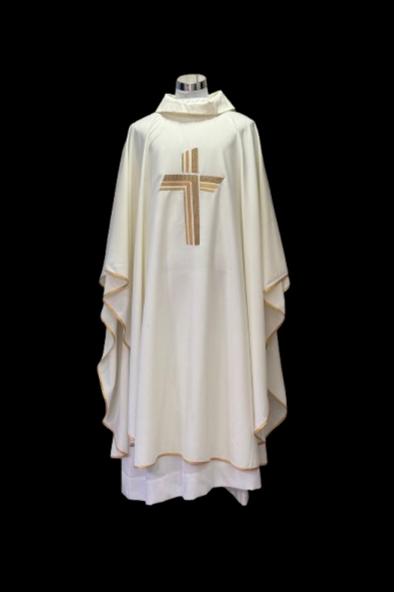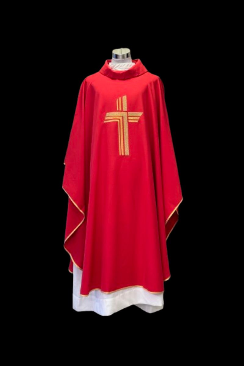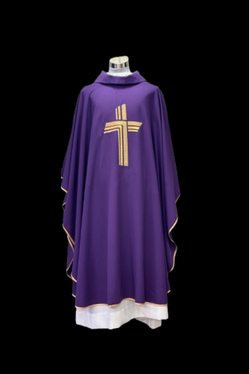 Disfrute de una casulla de alta calidad, con bordado de cruz en hilo de oro que le brinda un toque único. El ribete dorado satinado en los bordes complementa a la perfección el diseño. Confeccionada en tejido duradero para una mayor duración. ¡Obtenga un artículo exclusivo para sus servicios religiosos!