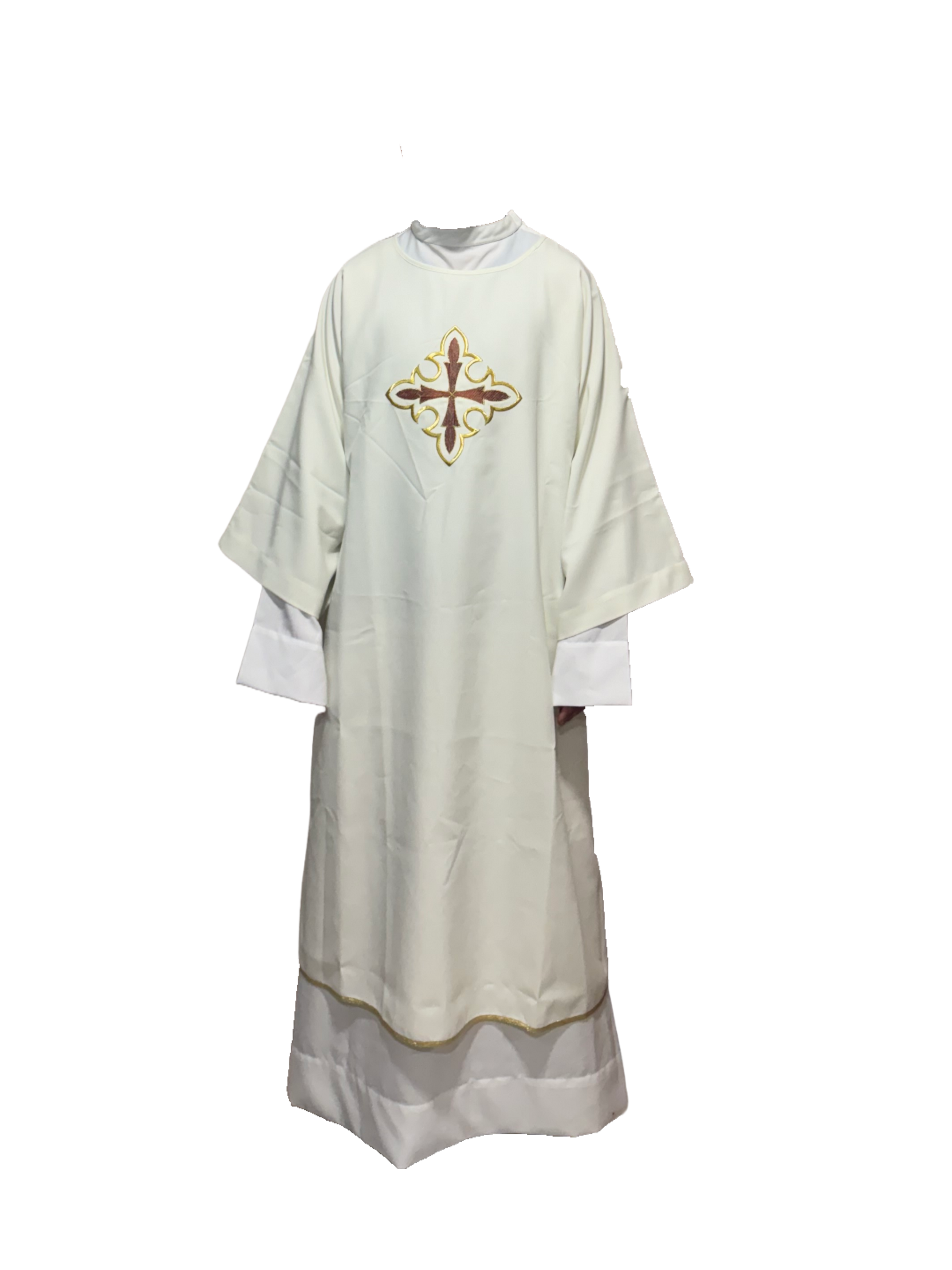 Dalmática importada de Europa, confeccionada con materiales de alta calidad y diseñada para ceremonias litúrgicas solemnes. Presenta un elegante bordado de cruz dorada en el pecho, resaltando la tradición y la belleza del vestuario sacerdotal. Ideal para celebraciones en tiempos de fiesta y solemnidades.
