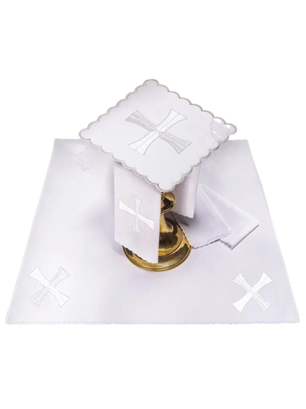 Purificador - Este producto está hecho de tela de algodón de aproximadamente 40 cm de largo y 25 cm de ancho. Está decorado con un bordado que representa cruces de plata y los bordes están ribeteados con un bordado.