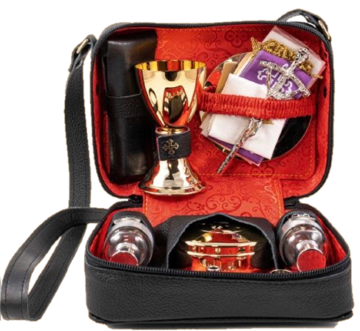 Contiene: Cáliz 10,5cm, Asperge, Porta viatico, Porta oleo, Altar porta Cruz y vela, vinajeras 30ml, estola, paños litúrgicos, patena.