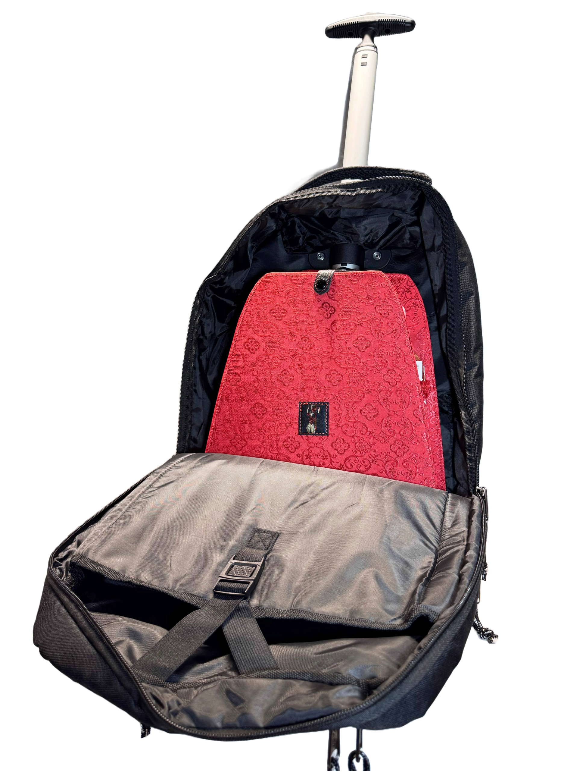 Mochila trolley fabricada en tejido técnico e impermeable, con espalda y hombros acolchados. Está equipado con un panel de almacenamiento extraíble, forrado en satén rojo.