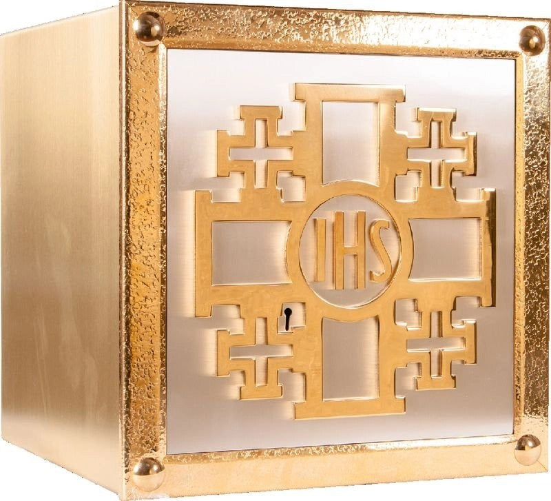 El Tabernáculo es una pieza de hierro forrada con laminas de bronce bañadas en oro y plata. Su interior cuenta con un diseño biselado, brindando una apariencia elegante y sofisticada. Ideal para iglesias, este tabernáculo es una excelente adición que aportará un toque de belleza y solemnidad a cualquier espacio.